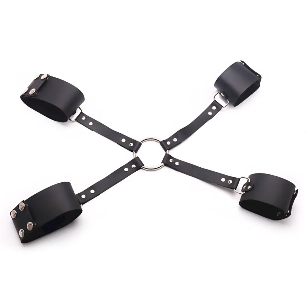 Composto por tecido sintético de couro com peças metálicas. Ideal para você prender as mãos e pernas do seu amado e realizar brincadeiras. Para complementar você pode utilizar uma chibata, ou outro acessório de sua preferência. Liberte a dominadora que existe em você, use e abuse da sexualidade.