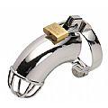 É um cinto de castidade masculino em aço com 1 argola para escroto, e ponta vazada.