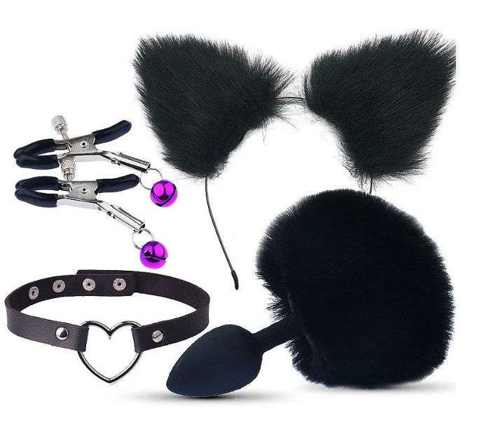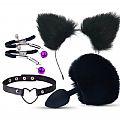 Kit - Rabo de Coelho com Tiara de Orelhas - Grampos para os seios em Metal e Gargantilha Preto